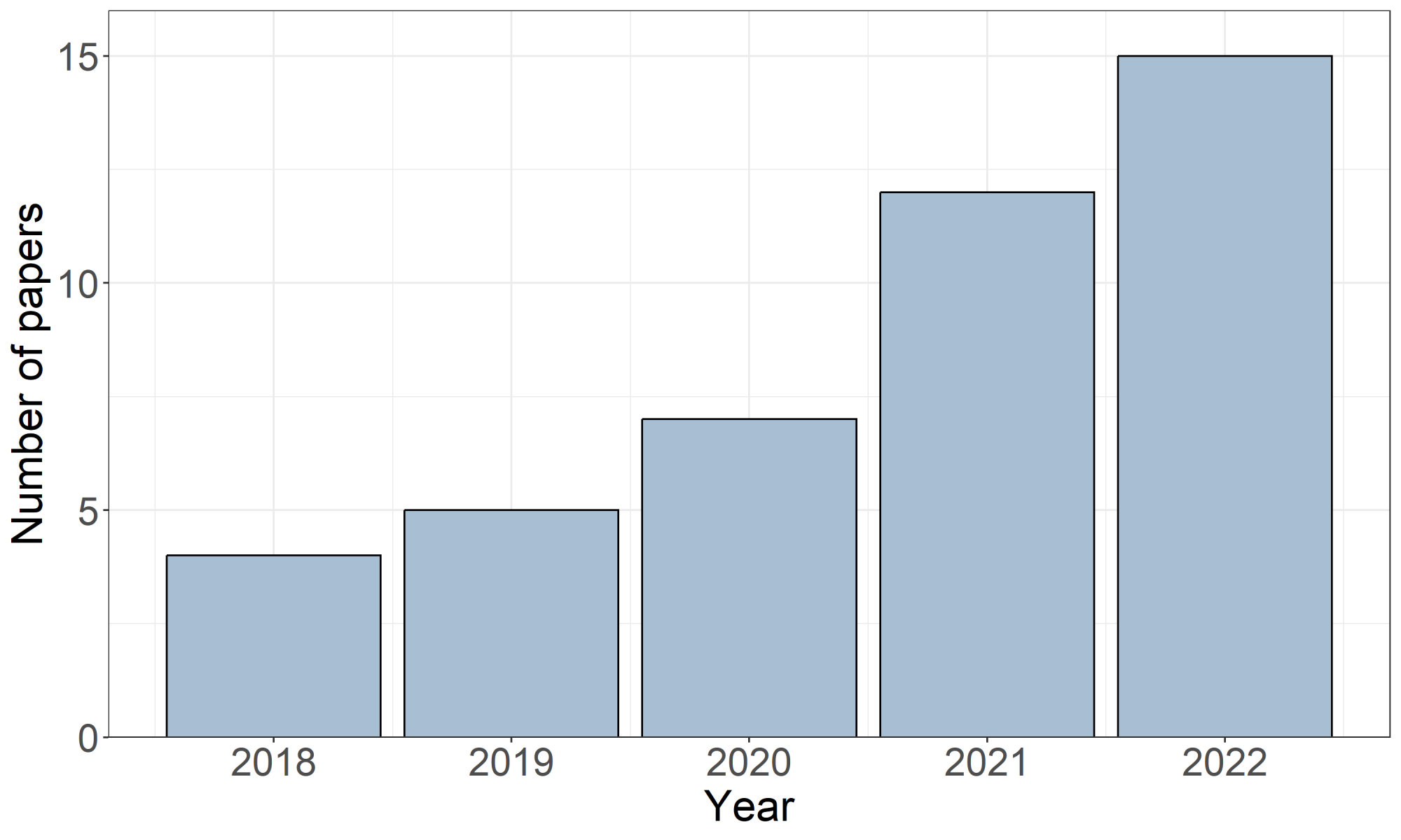 Note: The data include articles from the following 10 journals: American Economic Review, Econometrica, Journal of Economic Perspectives, Journal of Monetary Economics, Journal of Political Economy, Journal of Econometrics, Quarterly Journal of Economics, Review of Economic Studies, American Economic Journal: Macroeconomics, American Economic Journal: Microeconomics. The relevant papers are identified using the following search terms: machine learning, ensemble learning, deep learning, statistical learning, reinforcement learning and natural language processing.