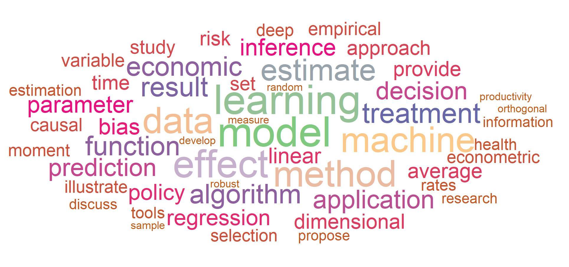 Note: Our dataset of articles about machine learning, collected from prominent economics journals, is visualized through word clouds of their titles and abstracts. These word clouds display term frequency, with larger fonts indicating higher usage. For instance, “machine” and “learning” appear prominently in titles and abstracts, underlining their significance.