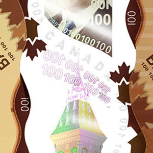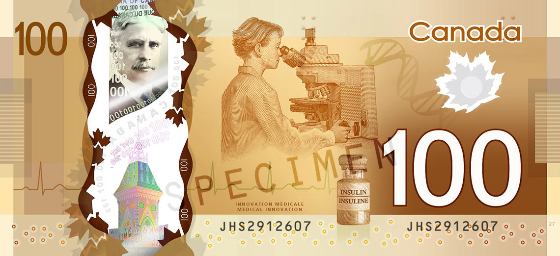 L’acide désoxyribonucléique (ADN) constitue la carte génétique de la vie. Le brin d’ADN qui figure sur le billet de 100 $ rend hommage aux chercheurs qui ont joué un rôle de chef de file dans le décodage du génome humain – une importante percée en science médicale. Cette illustration a été créée pour la Banque par une équipe de scientifiques et adaptée au graphisme du billet. Elle ne vise pas à représenter un élément particulier de la structure de l’ADN. Certains des éléments graphiques du billet de 100 $ illustrent l’histoire de la recherche médicale au Canada tandis que le brin d’ADN représente l’avenir de l’innovation médicale.