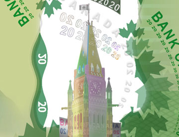 Le Monument commémoratif du Canada à Vimy ornant le billet de 20 $ honore la contribution du Canada et les sacrifices consentis durant les conflits militaires qui ont jalonné son histoire. Érigé sur le site de la bataille de la crête de Vimy, qui a eu lieu en France en 1917, le monument rend hommage aux Canadiens ayant servi sous les drapeaux au cours de la Première Guerre mondiale.