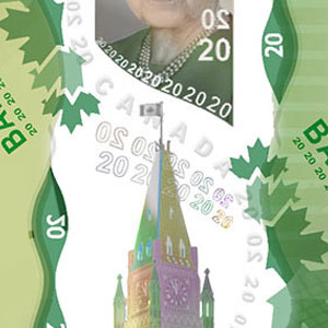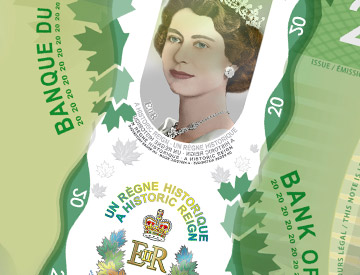 Ce billet commémoratif est une variante de l’actuel billet de 20 $ en polymère, déjà orné du portrait de la Reine. La différence est que la bande transparente présente de nouveaux éléments visuels : un portrait à reflets métalliques de la reine Elizabeth II datant de 1951, des symboles à reflets métalliques et le texte « A Historic Reign • Un règne historique ».