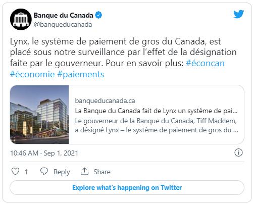 Lynx, le système de paiement de gros du Canada, est placé sous notre surveillance par l’effet de la désignation faite par le gouverneur. Pour en savoir plus: #éconcan #économie #paiements Septembre 1, 2021