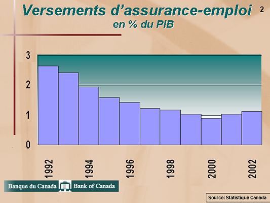 Premièrement, les prestations d'assurance-emploi ont été restructurées afin de renforcer l'incitation au travail. Par suite de ces changements, et de la meilleure tenue de l'économie, les versements d'assurance-emploi en proportion du PIB ont diminué considérablement depuis dix ans, passant de plus de 2 1/2 % à un peu plus de 1 %, comme vous pouvez le voir au Graphique 2.