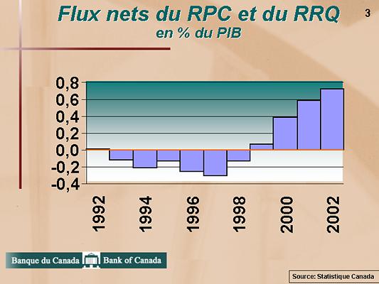 Deuxièmement, le Régime de pensions du Canada (RPC) et le Régime de rentes du Québec (RRQ) ont été réorganisés afin qu'ils reposent sur des assises financières solides. Pour accomplir ces réformes, il a fallu restructurer les prestations dans une certaine mesure et relever substantiellement les cotisations. Ces décisions n'ont certes pas été populaires, mais elles étaient nécessaires. Les résultats sont présentés au Graphique 3. L'actif du RPC est maintenant géré par un organisme indépendant du gouvernement, l'Office d'investissement du régime de pensions du Canada. Ce dernier a pour mandat de placer les cotisations sur les marchés afin qu'elles génèrent le meilleur rendement possible. Grâce à ces changements, les Canadiens n'ont plus à s'inquiéter de la capacité des gouvernements de leur verser leurs pensions dans le cadre du RPC ou du RRQ.