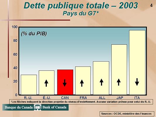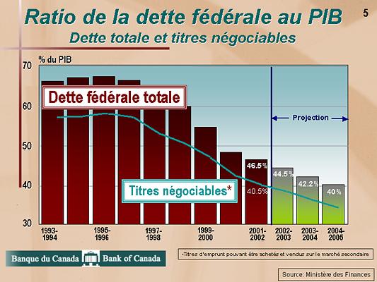 Ces efforts portent leurs fruits. Aujourd'hui, le niveau d'endettement du Canada est l'un des moins élevés des pays du G7. En outre, tel que l'indiquent les flèches du Graphique 4, il continue de baisser. Le gouvernement fédéral a remboursé près de 50 milliards de dollars sur sa dette souveraine, la ramenant d'un sommet de près de 70 % du PIB en 1996 à environ 45 % en 2002, comme le montre le Graphique 5. Ainsi, le cercle vicieux des déficits et de l'endettement croissants des années 1970 et 1980 s'est métamorphosé en un cercle vertueux, caractérisé par l'équilibre budgétaire et le recul de la dette.