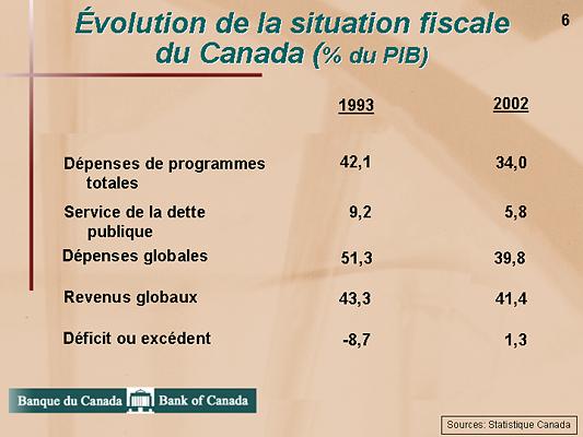 Ainsi que vous pouvez le voir dans le tableau, les dépenses de programmes de tous les ordres de gouvernement ont baissé à 34 % du PIB l'an dernier, comparativement à 42 % en 1993. Les coûts du service de la dette publique ont également diminué, passant d'environ 9 % du PIB à moins de 6 %.