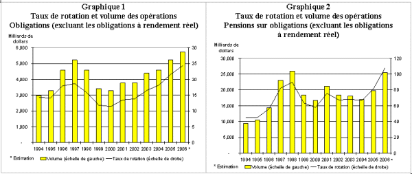 En 2006, le taux de rotation des obligations du gouvernement canadien et des opérations de pension sur ces titres, qui est un indicateur très répandu de la liquidité générale d'un marché, a en fait atteint des niveaux record (voir les Graphiques 1 et 2). D'après les données, c'est sur le marché des obligations de trois à dix ans que le taux de rotation est le plus élevé. Bon nombre d'investisseurs internationaux, par exemple, ont accru leurs achats de produits à revenu fixe canadiens, ce qui a entraîné une hausse du volume des opérations à la fois sur les marchés au comptant et sur les marchés de produits dérivés, notamment pour les contrats à terme sur obligations de dix ans (CGB). Cependant, certains participants estiment que l'augmentation des taux de rotation, ainsi que l'amenuisement des écarts entre les cours acheteur et vendeur, est peut-être due à une hausse du nombre des transactions de faible montant, mais que la liquidité ne s'est pas pour autant améliorée dans le cas des transactions de montant élevé.