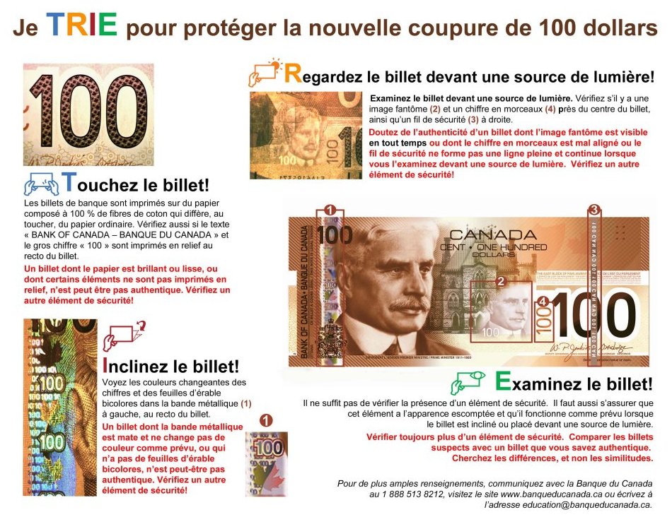 La Banque du Canada et le Service de police de Toronto rappellent au public et aux commerçants qu'ils doivent examiner attentivement les billets qu'ils reçoivent. En effet, des faux billets de 100 dollars ont été passés au cours des dernières semaines, principalement dans la région du Grand Toronto.