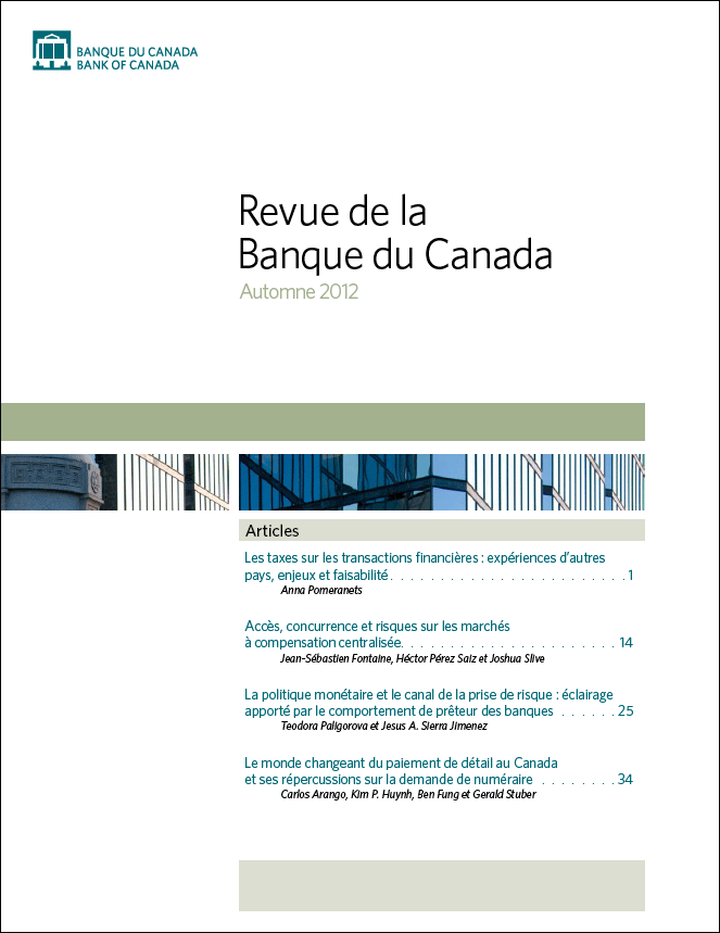 Cette livraison renferme quatre articles où sont décrites les recherches et les analyses du personnel de la Banque du Canada. Le premier traite des taxes sur les transactions financières; le second, du rôle des contreparties centrales sur les marchés de gré à gré; le troisième, de la politique monétaire et du canal de la prise de risque, envisagé sous l’angle du comportement de prêteur des banques. Le quatrième article présente les conclusions de travaux sur l’utilisation des instruments de paiement de détail et aborde les effets que les innovations dans ce domaine pourraient avoir à long terme sur le recours au numéraire.