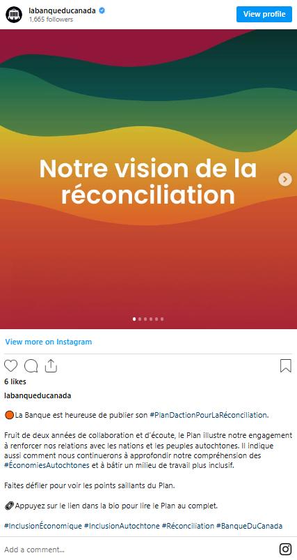 En ce qui concerne son plan d’action pour la réconciliation, la Banque a réalisé des progrès par rapport à plusieurs engagements :