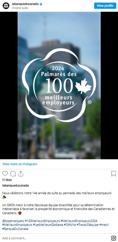 Pour la 15e année d’affilée, la Banque s’est classée parmi les 100 meilleurs employeurs du Canada (en anglais seulement). Ce prix témoigne de son engagement à offrir un excellent milieu de travail. De plus, elle a été reconnue à nouveau parmi :