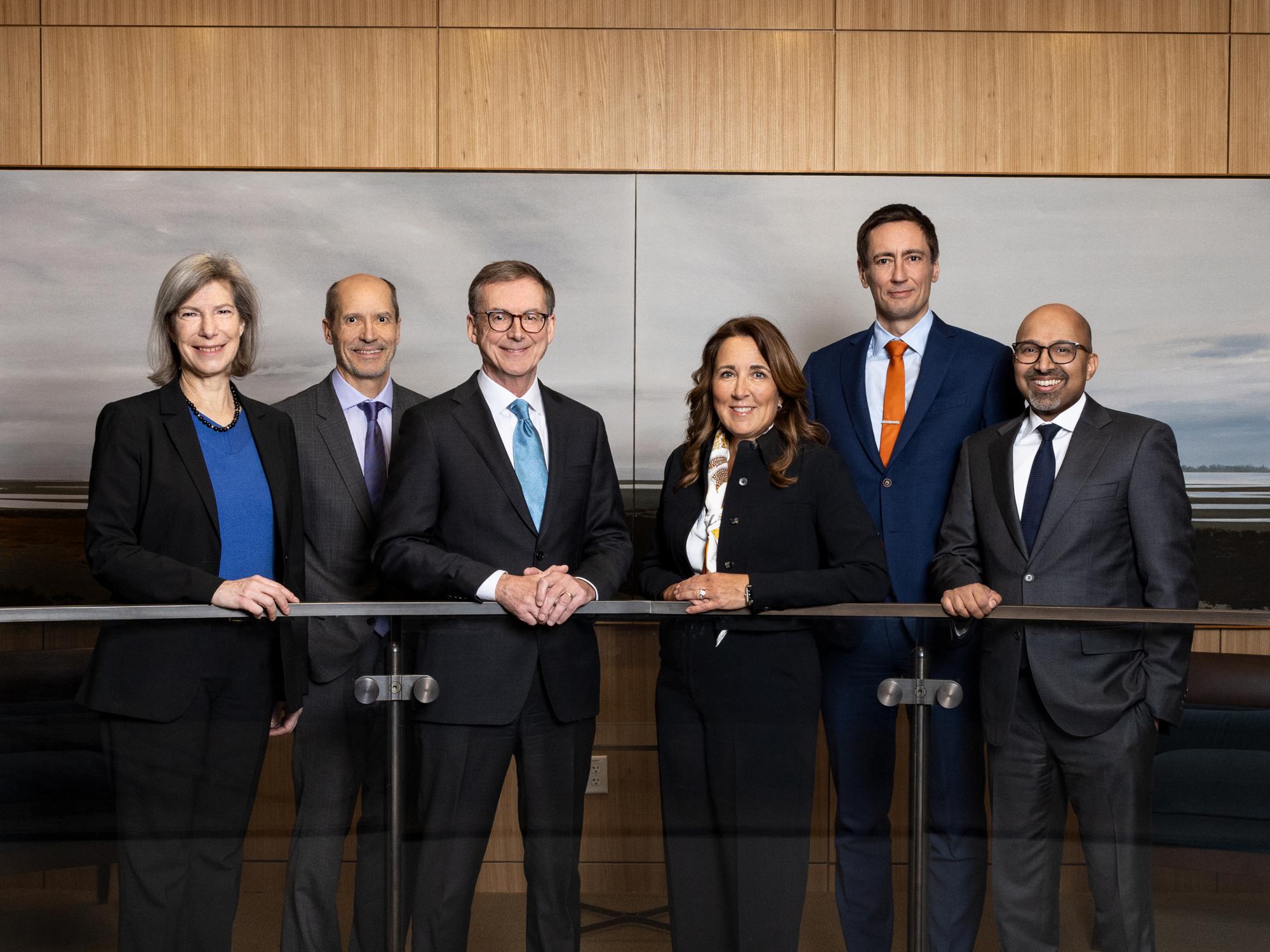 Le Conseil de direction de la Banque du Canada (de gauche à droite) : la sous-gouverneure Sharon Kozicki; le sous-gouverneur Toni Gravelle; le gouverneur Tiff Macklem; la première sous-gouverneure Carolyn Rogers; le sous-gouverneur externe Nicolas Vincent; et le sous-gouverneur Rhys Mendes.